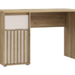 Centralny element mebli przyciąga wzrok dzięki efektownym lamelom, które harmonijnie komponują się z pozostałymi frontami w jasnym dekorze Sand. Ciepły odcień dębu Mauvella na korpusach dodaje całości przytulnego charakteru.